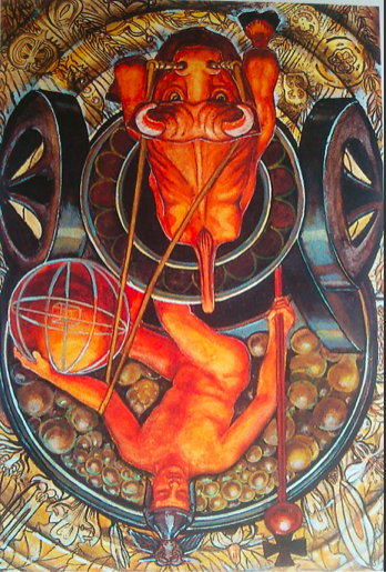 (Let there be a short digression with regard to the signs of the Zodiac. In the case of each element, the Cardinal sign represents the swift, impulsive onrush of the idea. In the Kerubic sign, the element has come to its full balance of power; and in the other signs the force is fading away. Thus, Aries represents the rush of fire, Lightning; Leo, its power, the Sun; and Sagittarius, the rainbow,its sublimation. Similar considerations apply to the other elements. See the Attributions section: The Triplicities of the Zodiac.)